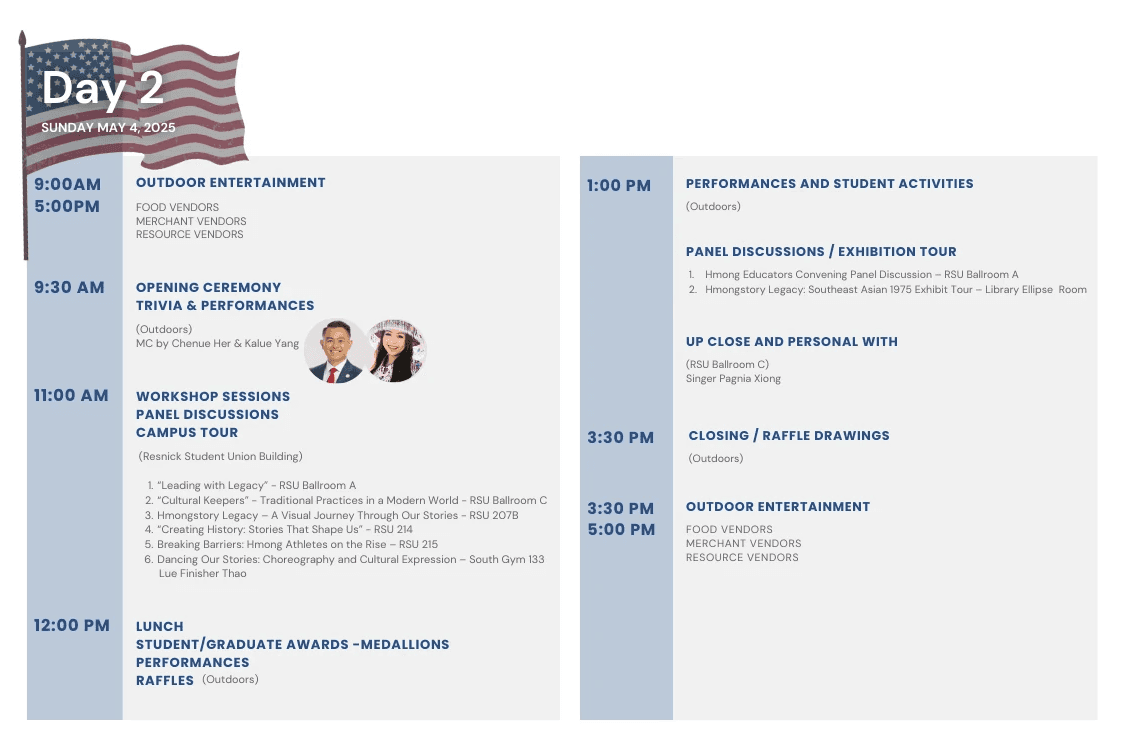 Day 2 of Hmong American Day keeps the celebration going with a full schedule of workshops, cultural panels, and lively performances that highlight the heart and soul of the Hmong community. Dive into engaging activities for all ages while enjoying music, dance, and storytelling that honor our traditions and future. Don’t miss the chance to explore a vibrant variety of community vendors, resource booths, and delicious food offerings that bring people together. It’s a day of connection, culture, and celebration—come be part of it!
