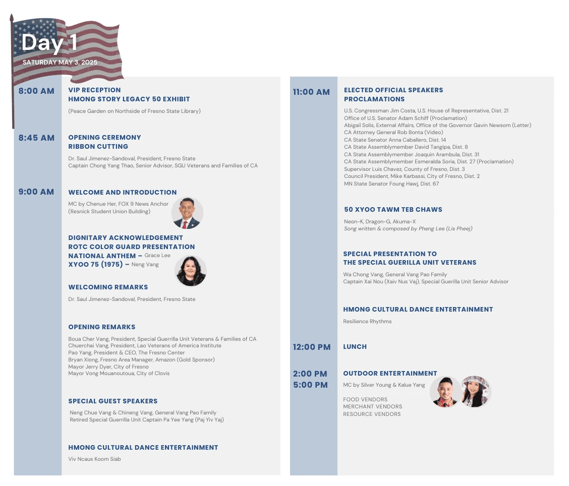 Join us for an exciting kickoff to Hmong American Day with a packed Day 1 agenda you won’t want to miss! Begin your journey through history at the Hmong Story Legacy 50 Exhibit, a powerful showcase honoring 50 years of resilience, culture, and community. Witness the official opening ceremony and ribbon cutting, then meet our charismatic MC, Chenue Her, along with a lineup of inspiring speakers. Throughout the day, enjoy dynamic performances and storytelling that connect our rich heritage to the leaders shaping today’s Hmong American future. Come celebrate, learn, and be inspired!